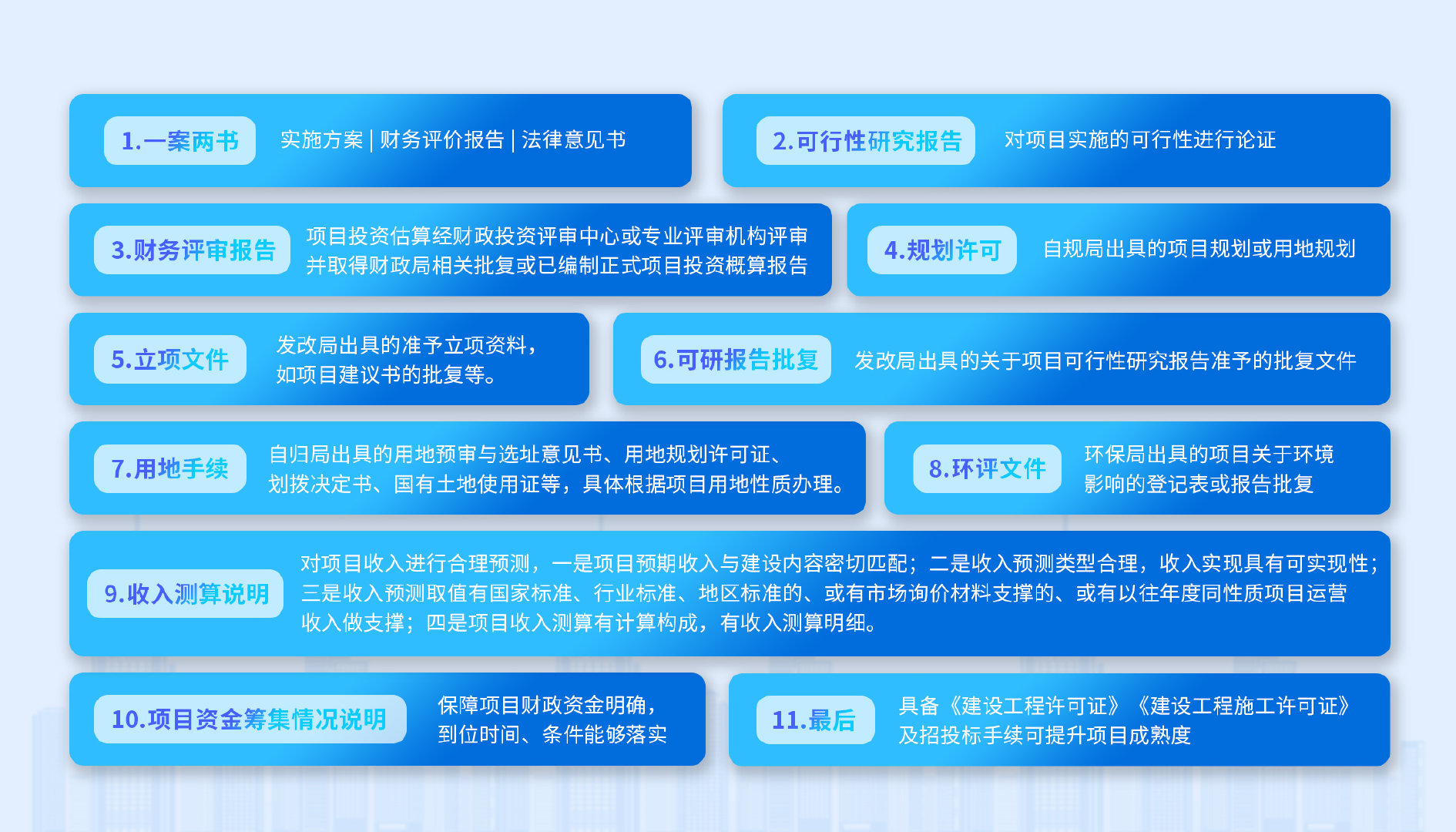 在項(xiàng)目?jī)?chǔ)備階段,含《項(xiàng)目建議書(shū)》、《項(xiàng)目可行性研究報(bào)告》兩大材料的編制,2022年起增加事前績(jī)效評(píng)價(jià)相關(guān)材料要求;項(xiàng)目申報(bào)階段包含《項(xiàng)目建議書(shū)》批復(fù)、《項(xiàng)目可研報(bào)告》批復(fù)、《項(xiàng)目實(shí)施方案》,其他非必要材料例如《環(huán)評(píng)報(bào)告》、《安評(píng)報(bào)告》、四證一書(shū)可按實(shí)際情況提供;第三是方案編制階段,申報(bào)組織需提供《收益與融資自求平衡測(cè)算方案》以及《財(cái)務(wù)評(píng)價(jià)書(shū)》;最后,方案評(píng)估和發(fā)行階段,需提供《財(cái)務(wù)評(píng)價(jià)書(shū)》(正式稿)以及《法律意見(jiàn)書(shū)》兩項(xiàng)材料。