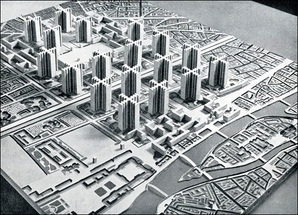 機械系統論下的功能主義城市意象。柯布西耶,伏瓦生規劃,1922-1925。
