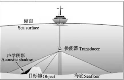 側掃聲納是利用專用的探頭發射聲納信號。聲納探頭發出的信號呈扇形向下傳播,扇形在水平角方向為0.6°~1.9°,而在垂直角方向為32°,當聲納信號到達江底時,就會產生反射和散射。接收器接收來自江底的返回聲納,儀器設備根據接收到的聲納信號的時間及角度,經過計算機處理就可以描繪出該扇形區域江底的相對深度變化,從而得到江底的地貌起伏情況和存在江底(海底)的沉船及其它近表面的物體等的具體位置、形態和尺寸。