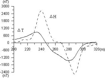 實線—實測磁異常 虛線—向下延拓8.0m、化向磁赤道的剩余磁場異常