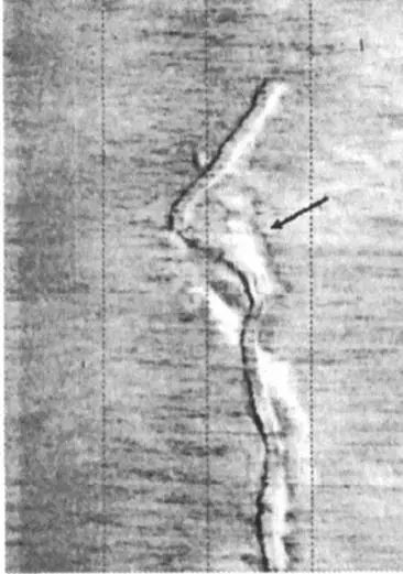 本實例為上海京海工程技術公司上級單位中國地質科學院物化探研究所采用側掃聲納探測得到的資料。圖5是一段裸露于海底面上的電纜的側掃聲納圖像。該電纜為多年前采用水力噴射埋設方式鋪設,但是由于鋪設時未能準確的將該電纜放入噴射出的溝槽內,從而導致該電纜露在海底面上。