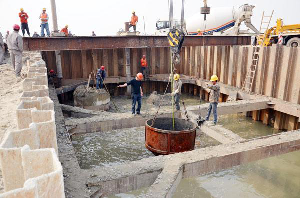 用袋砌法澆筑水下混凝土,系把混凝土半滿地裝入牢固的麻袋或布袋中,由潛水員在水下進(jìn)行砌澆。袋的孔隙應(yīng)能使砂漿滲出但不宜過(guò)大。采取這種澆筑方法,袋與袋之間的層面,雖然可以從袋孔中擠出的水泥漿互相膠結(jié),但其整體性終究是很差的。此種混凝土的坍落度以5~7cm為宜,不得采用干拌混凝土。混凝土袋應(yīng)交錯(cuò)放置,相互靠緊。