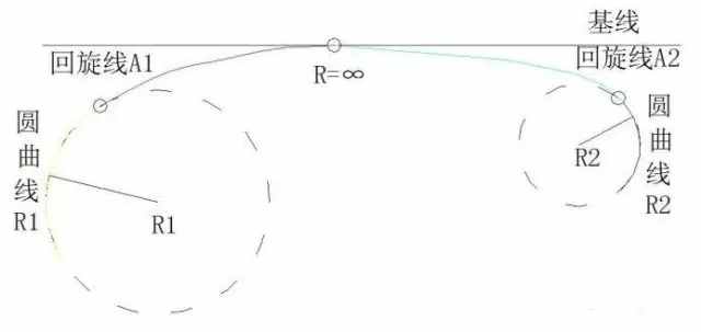 緩和曲線1+圓曲線1+緩和曲線(過(guò)渡)+圓曲線2+緩和曲線2
