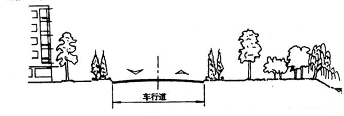 路面兩側(cè)不設(shè)高出的路緣石,而有保護(hù)路面的路肩,路肩外設(shè)明溝排除道路及兩側(cè)建筑用地的雨水;
