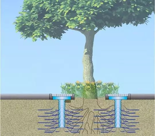 樹池的標高一般比路面低一些,用以收集、初步過濾雨水徑流。就行道樹而言,一系列連貫的樹池可以被設計成潛在的收水裝置,最大限度地發揮收集、過濾雨水徑流的作用。