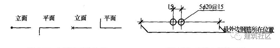 (9)在鋼筋構(gòu)造圖中,當(dāng)有指向閱圖者彎折的鋼筋時(shí),應(yīng)采用黑圓點(diǎn)表示;當(dāng)有背向閱讀者彎折的鋼筋時(shí),應(yīng)采用“X”表示(圖2—55)