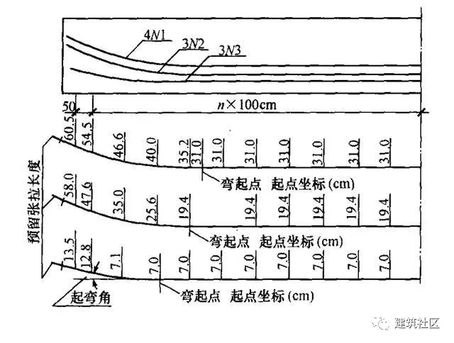 (5)對彎起的預(yù)應(yīng)力鋼筋應(yīng)列表或直接在預(yù)應(yīng)力鋼筋大樣圖中,標(biāo)出彎起角度、彎曲半徑切點(diǎn)的坐標(biāo)(包括縱彎或既縱彎又平彎的鋼筋)及預(yù)留的張拉長度(圖2-47)。