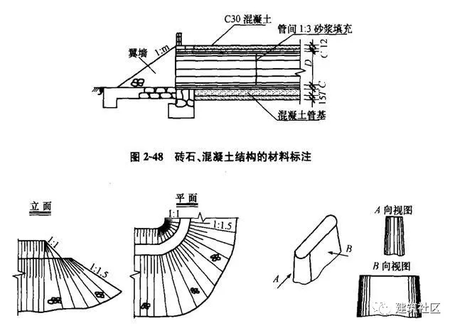 (1)磚石、混凝土結(jié)構(gòu)圖中的材料標(biāo)注,可在圖形中適當(dāng)位置,用圖例表示(圖2-48)。當(dāng)材料圖例不便繪制時(shí),可采用引出線標(biāo)注材料名稱及配合比。