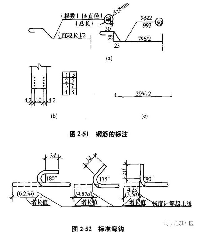 (5)鋼筋末端的標(biāo)準(zhǔn)彎鉤可分為90°, 135°, 180°三種(圖2-52)。當(dāng)采用標(biāo)準(zhǔn)彎鉤時(shí)(標(biāo)準(zhǔn)彎鉤即最小彎鉤),鋼筋直段長的標(biāo)注可直接注于鋼筋的側(cè)面(圖2-52)。