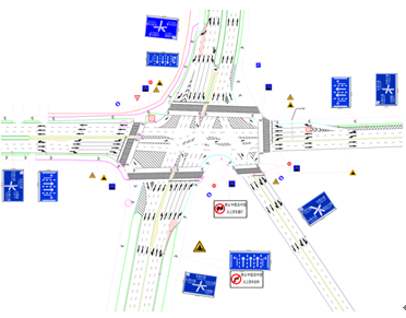 為了減少右轉(zhuǎn)車輛與非機(jī)動(dòng)車和行人的相互沖突,保證非機(jī)動(dòng)車和行人安全順利過街。優(yōu)化設(shè)計(jì)方案中各路口均增設(shè)行人讓行標(biāo)志標(biāo)牌以及各類護(hù)欄。同時(shí),為了保證車輛進(jìn)入交叉口前獲得道路信息和行車信息各路口增設(shè)了行車道指示牌和道路指示牌。