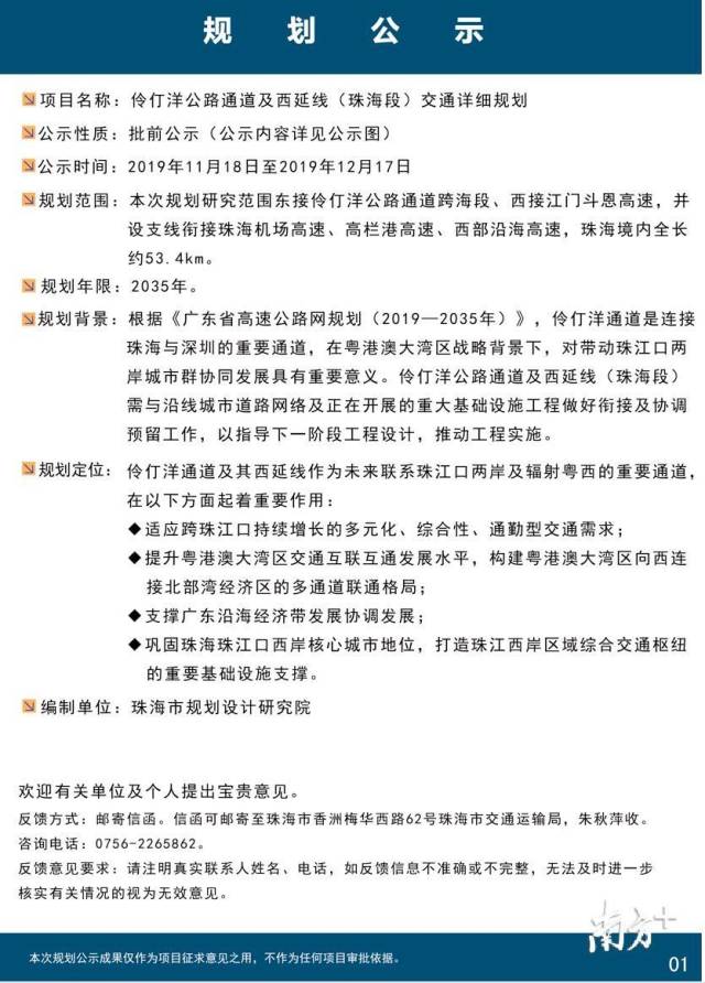 18日,珠海市交通運(yùn)輸局官網(wǎng)公布關(guān)于《伶仃洋公路通道及西延線(珠海段)交通詳細(xì)規(guī)劃》(下稱(chēng)《規(guī)劃》)公開(kāi)征求意見(jiàn)的公告,向社會(huì)征求意見(jiàn)意見(jiàn)和建議。