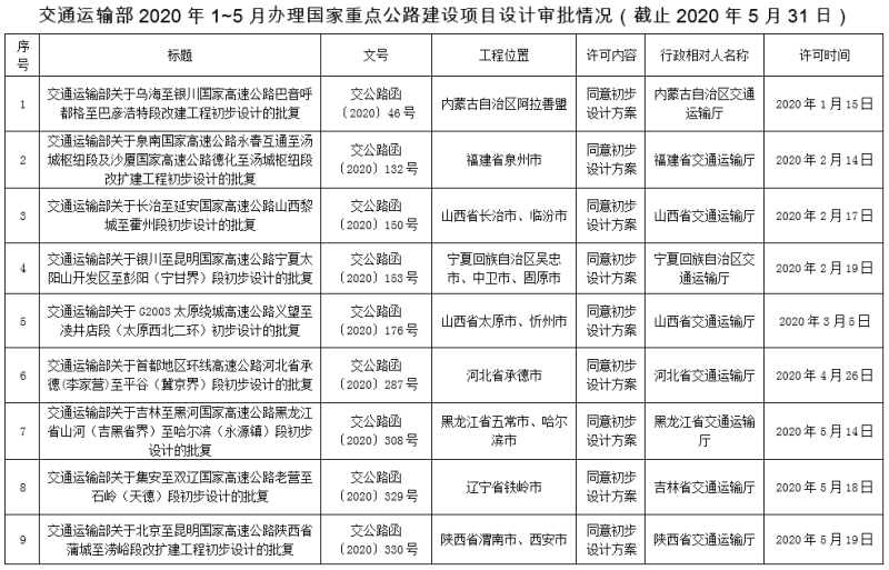 交通運(yùn)輸部2020年1~5月辦理國家重點(diǎn)公路建設(shè)項(xiàng)目設(shè)計(jì)審批情況(截止2020年5月31日)