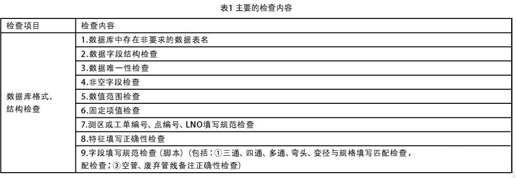 目前,全國(guó)各管線單位要求生產(chǎn)單位提交的數(shù)據(jù)集一般是Microsoft Office Access數(shù)據(jù)庫(kù)的mdb文件.數(shù)據(jù)庫(kù)格式、結(jié)構(gòu)檢查主要檢查管線數(shù)據(jù)庫(kù)中的數(shù)據(jù)表是否齊全是否存在多余的表、表的字段名和數(shù)據(jù)類型是否正確、字段值的填寫格式是否符合規(guī)程的要求等.主要的檢查內(nèi)容見表1: