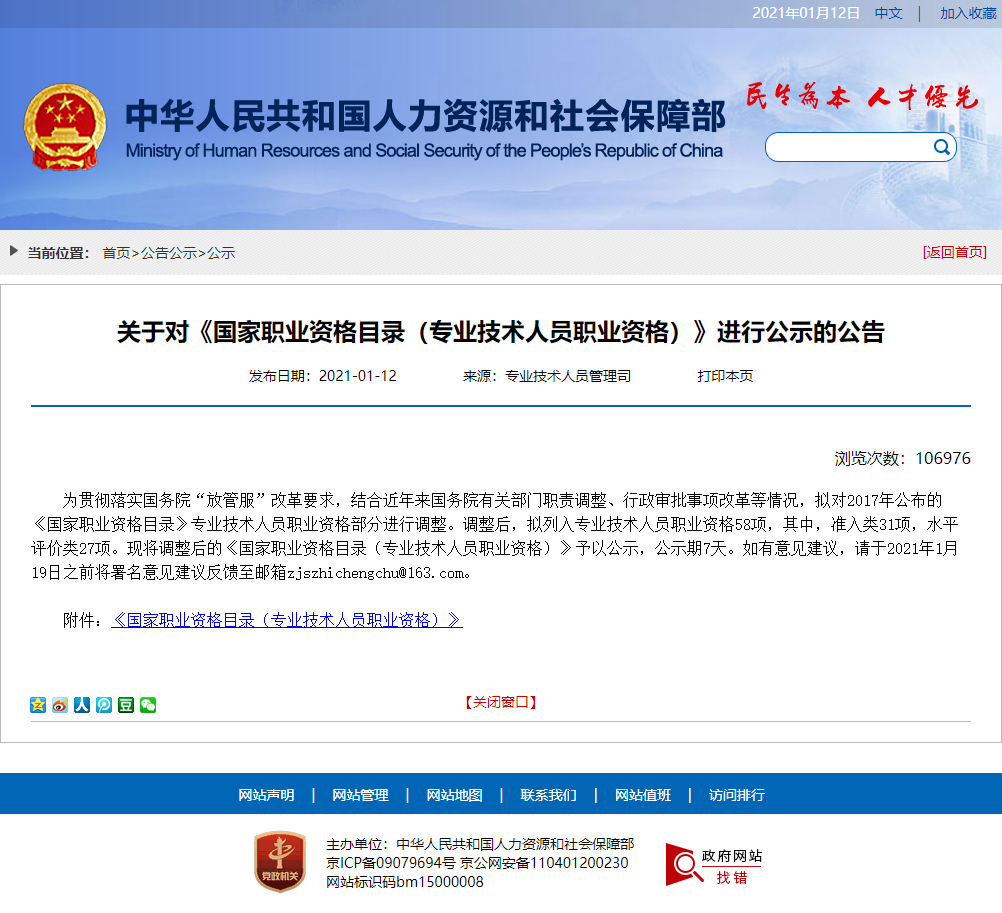 為貫徹落實國務院“放管服”改革要求,結合近年來國務院有關部門職責調整、行政審批事項改革等情況,擬對2017年公布的《國家職業資格目錄》專業技術人員職業資格部分進行調整。調整后,擬列入專業技術人員職業資格58項,其中,準入類31項,水平評價類27項。現將調整后的《國家職業資格目錄(專業技術人員職業資格)》予以公示,公示期7天。如有意見建議,請于2021年1月19日之前將署名意見建議反饋至郵箱zjszhichengchu@163.com。