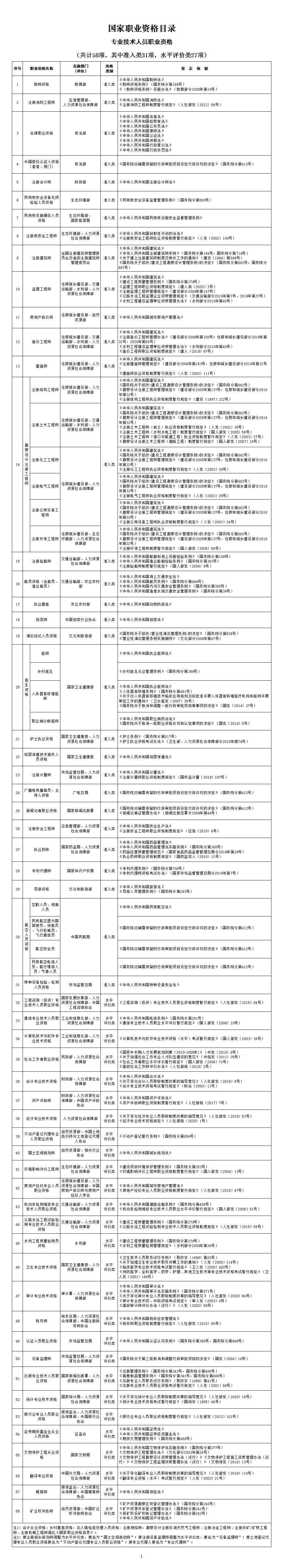 注1:會計從業資格,鄉村獸醫資格,出入境檢疫處理人員資格,注冊測繪師,勘察設計注冊石油天然氣工程師、注冊冶金工程師、注冊采礦/礦物工程師、注冊機械工程師調出《國家職業資格目錄》。