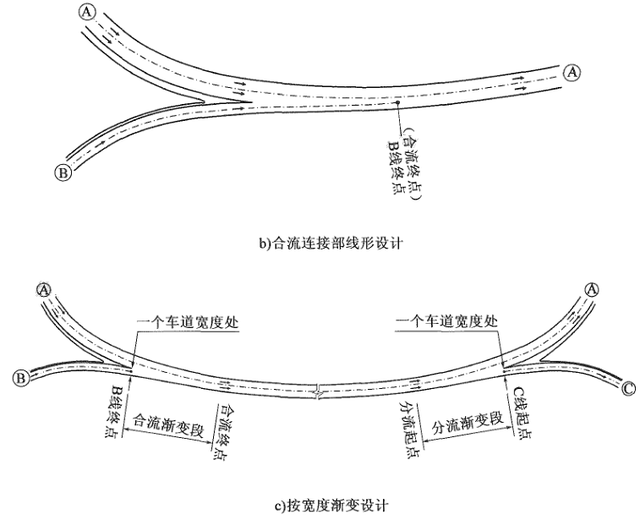《細(xì)則》給出的分合流示意圖不夠全面。分合流連接部,建議依據(jù)車道個(gè)數(shù)適應(yīng)交通量的情況,可采用插入式、漸變式和直接式、輔助式,或其組合。