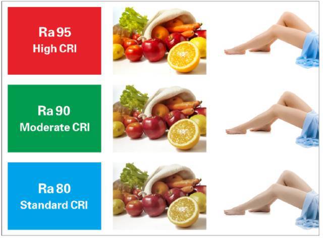 是指物體被光源發(fā)出的光照明時色彩被還原的真實程度。白熾燈的顯色指數(shù)為100,也就是說它對于色彩的還原性可以做到100%。現(xiàn)在市面上對于LED光源的應(yīng)用越來越普及,住宅照明產(chǎn)品光源的顯色指數(shù)都應(yīng)該要大于80,優(yōu)質(zhì)LED光源的顯色指數(shù)能達(dá)到90以上甚至95,但是有一大部分的劣質(zhì)產(chǎn)品其光源的顯色指數(shù)都不到70,所以用戶在選擇的時候一定要引起注意。下面關(guān)于顯色指數(shù)的對比圖可以有一個相對直觀的感受: