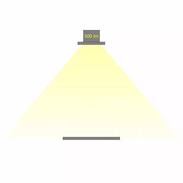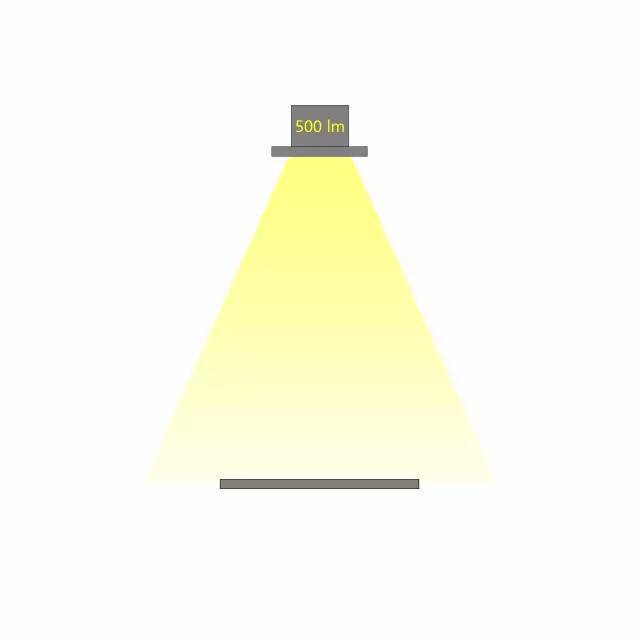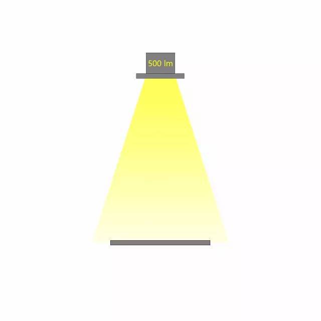 相同光通量的燈具,不同的配光角度,在相同的距離照射到同一個平面,所產(chǎn)生的照度是不同的。配光角度越大,相同距離的照度越小。如下圖,燈具的光通量為500lx,當(dāng)配光角度不同時,相應(yīng)的照度也會不同。