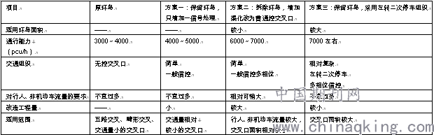 根據以上分析的環形交叉口可進行的改造方案,對各個方案見進行比較,結果如下表1。
