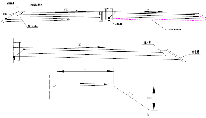 6.倒虹吸與渡水槽:當水流需要橫跨路基,同時受到設計標高的限制,可以采用管道或溝槽,從路基底部或上部架空跨越,前者稱倒虹吸,后者為渡水槽,分別相當于涵洞和渡水橋。兩者屬于路基地面排水的特殊結構物,并且多半是配合農田水利所需而采用。