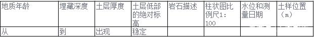 鉆孔地質(zhì)柱狀圖是表示該鉆孔所穿過的地層而綜合成圖表表示。圖中表示有地質(zhì)年代、土層埋藏深度、土層厚度、土層底部的絕對(duì)標(biāo)高、巖土的描述、柱狀圖、地面絕對(duì)標(biāo)高、地下水水位和測(cè)量日期、巖土怎樣選取位置等。柱狀圖的比例尺一般為1:100—1:500。