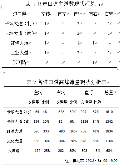該交叉口各進口道車道設(shè)置和流量現(xiàn)狀表-1和表-2所示。由表-2可知,長堎大道和紅灣大道交通流量較大。實際調(diào)查中大中型車輛所占比例達到30%左右均集中在長堎大道和紅灣大道。