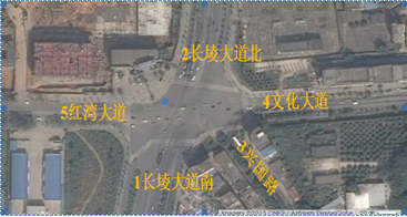 該交叉口位于江西省南昌市新建區(qū)中心城區(qū)西部。由長堎大道、紅灣大道、文化大道、興國路五路交叉組成。其中長堎大道南北方向雙向六車道主干道,紅灣大道、文化大道是連接新建區(qū)和灣里區(qū)的主要交通干道,興國路連接新建區(qū)中心城區(qū)并設(shè)有多條公交線路。該交叉處在新建區(qū)大力開發(fā)地段,周邊居民區(qū)密集、各道路沿途設(shè)有多家商業(yè)和購物中心,并輻射周邊的高校園區(qū)和工業(yè)園區(qū)。由于交叉口交通流量較大、多路相交,加上長堎大道建成通車后未能對交叉口各進出口道和內(nèi)部空間進行科學(xué)合理的交通渠化設(shè)計,導(dǎo)致交通混行,交通擁堵現(xiàn)象經(jīng)常發(fā)生。交叉口現(xiàn)狀如圖-1所示。