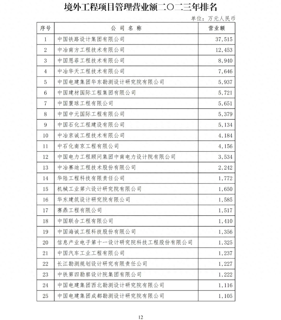 在各地方、各部門勘察設計同業協會支持與配合下,相關企業完成了工程項目管理、工程總承包等各項排序數據的自主申報工作,各地方、各部門勘察設計同業協會和總承包分會秘書處按照《勘察設計企業工程項目管理和工程總承包營業額排名活動管理辦法》(2018年修訂)對企業的申報數據進行了審核、匯總和復核。現批準公布工程項目管理、工程總承包、境外工程項目管理、境外工程總承包營業額二〇二三年排名(詳見附件)。