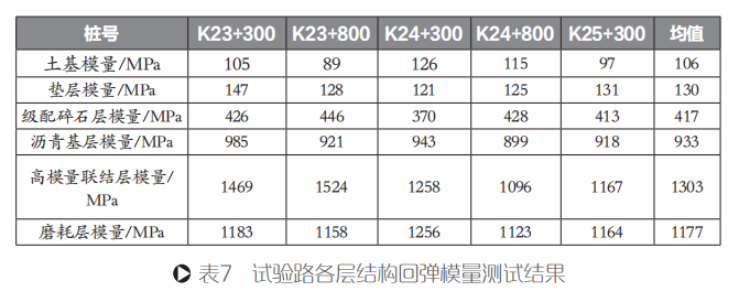 根據(jù)《公路路基路面現(xiàn)場測試規(guī)程》(JTG E60-2008),對試驗(yàn)路各層施工完成后進(jìn)行現(xiàn)場回彈模量試驗(yàn),其測試結(jié)果如表7所示。