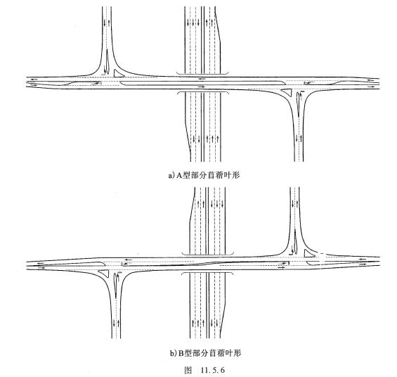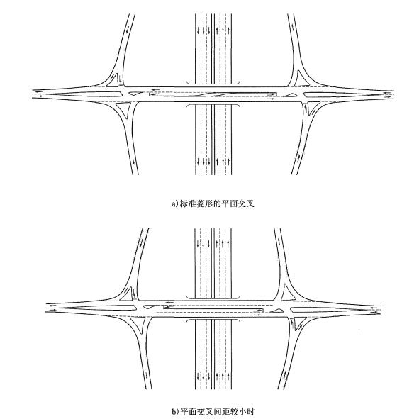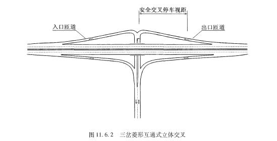 《規范》11.6.2條規定,菱形或苜蓿葉互通中的兩個平面交叉宜相互通視,凸曲線應保證停車視距,間距應容納兩個左轉車道,不宜設置人行橫道。
