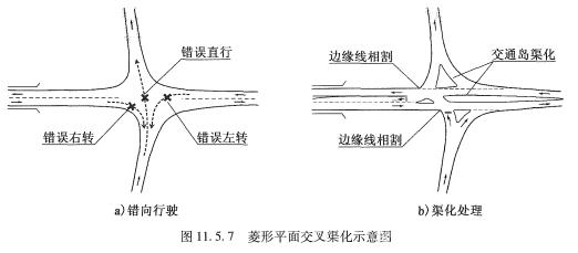 四岔菱形互通中,一般在次要公路上有2個平面交叉,因匝道為單向行駛,交叉中心容易導致誤行。主要公路為一級公路時,匝道端部一般不允許左轉,交叉次要公路可允許左轉,注意左轉岔道根部邊緣線相割,或不連續。