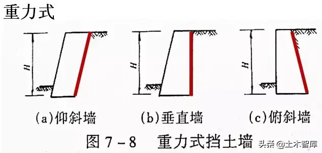 4、墻前地形平坦時,用仰斜墻較合理,墻前地形較陡時,用垂直較合理。