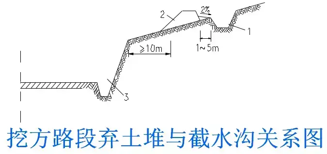 2.截水溝:又稱天溝,一般設置在挖方路基邊坡坡頂以外,或山坡路堤上方的適當地點,用以攔截并排除路基上方流向路基的地面徑流。