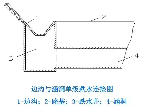 4.跌水與急流槽:跌水與急流槽是路基地面排水溝渠的特殊形, 用于陡坡地段,溝底縱坡可達45度。在陡坡或深溝地段設置的溝底為階梯,水流呈瀑布式跌落的溝槽稱作跌水。跌水的作用是在較短的距離內,降低水流流速,消減水流能量,進而防止沖刷(用于坡度大于10%,水頭高差大于1.0m的陡坡地段)