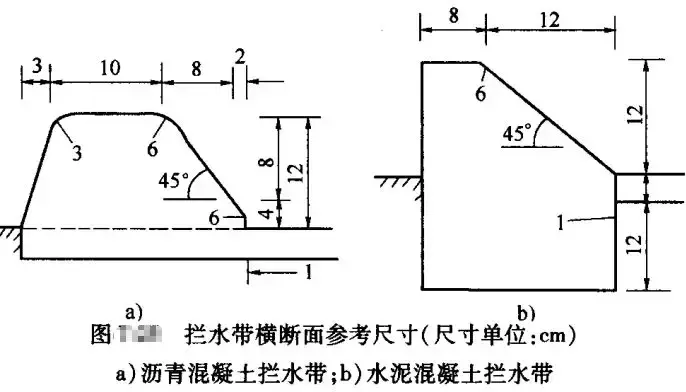 攔水帶可由瀝青混凝土現場澆筑,或者由水泥混凝土預制塊鋪砌而成。