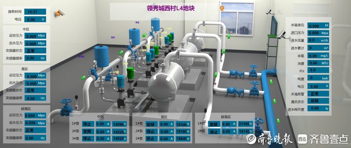 而在濟南水務集團二級供水監控中心內,大屏上正實時顯示每個二次泵站小區設備運行情況,值班人員時刻通過平臺查看設備電壓、用電量、進出廠壓力、水箱液位是否處于良好狀態。而這僅是智慧水務信息收集與檢測的一個縮影。